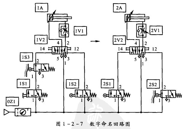 ①數字命名:如圖1-2 -7所示,元件按照控制鏈分成幾組。每一個執行元件連同相關的闊稱為一個控制鏈。O組表示能源供給元件. 1、2組分別代表兩個獨立的控制鏈。