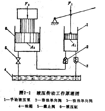 圖1-1為油壓機液壓千斤頂的工作原理圖。它是一種最簡單的液壓傳動裝置,通過它來說明液壓傳動的基本工作原理。