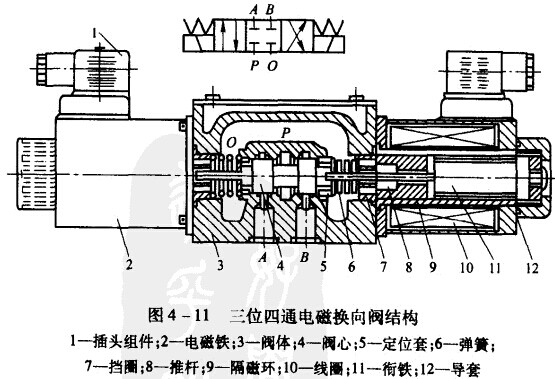 四柱油壓機電磁換向閥是利用電磁鐵吸力推動閥心換位的方向閥。它是電氣系統與液壓系統之閥的信號轉換元件,它的電氣信號由液壓設備的按鈕開關、限位開關、行程開關、壓力繼電器等發出,從而可以便液壓系統方便地實現各種操縱及自動順序動作。圖4-11是三位四通電磁換向閥的結構原理固和圖形符號。閥的兩端各有一個電磁鐵和一個對中彈簧,閥心在常態時處于中位。當右端電磁鐵通電吸合時,銜鐵通過推桿將閥心推至左端,換向閥就在右位工作;反之,左端電磁鐵通電吸合時,換向閥就在左位工作。