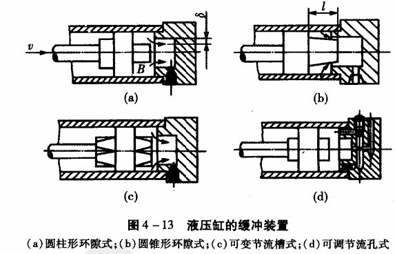 為了避免液壓機活塞在行程兩端撞擊缸蓋,一般液壓缸設有緩沖裝置。緩沖的原理是使活塞在與缸蓋接近時增大回油阻力,從而降低活塞運動速度。常用的緩沖裝置如圖4 -13所示。