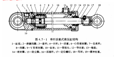 圖4.7-1為一種常見的單懺雙作用活塞式液壓缸。當油體固定時,口A進液,口B回液,返回行程時,迸液腔和回液膠交換。液壓缸通常缸體、銷量在、缸底、活塞、耳環、導向套及密封組件組成。