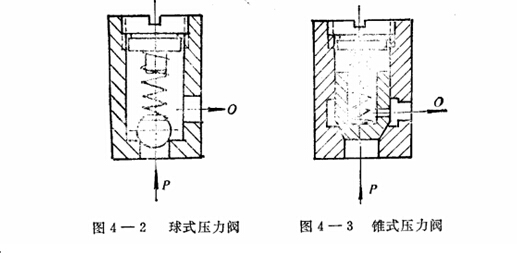 直動式溢流閥的工作原理如圖4-1所示,就溢流閥閥芯結構形式而言,圖4-1是滑閥式直動壓力閥。除此而外常見的還有球閥式和錐閥式,如圖1-2和圖4-3所示,它們統稱為閥座式壓力閥。在油壓小于彈簧力時,球形閥芯和錐形閥芯在彈簧力作用下緊緊壓在閥座上,密封性較好,閥芯和閥套之間沒有如同滑閥式壓力閥具有一定油封長度而產生的動作死區。只要油壓力超過彈簧力,閥芯立即開啟,靈敏性很高,壓力超調量小,所以在導控式溢流閥巾,不論導閥和主閥普遍采用錐閥結構。但因直動式球閥和錐閥式壓力閥在大流最時易發生振動和噪音,閥芯易和閥座發生撞擊,壽命短,故一般多作為安全閥使用。