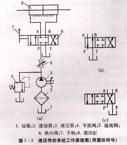 液壓傳動系統圖足一種半結構式的工作原理圖,直觀性強,容易理解,但于繪制。為了方便閱讀、分析、設計和繪制液壓系統,工程實際中,國內外都采用液壓元什的圖形符號來表示。按照規定,這些圖形符號只表示元件的功能,不表示元件的結構和參數,并以元件的靜止狀態或零化狀態來表示若液壓元件無法用圖形符號表述時,仍允許采用半結構原理表示。我國制定了液壓與氣動元(輔)件圖形符號(GB/T786. 11993).其中最常用的部分可參見附錄。圖1 3即為用圖形符號表達的圖1-2的液壓機往復運動工作臺的液壓傳動系統工作原理圖。