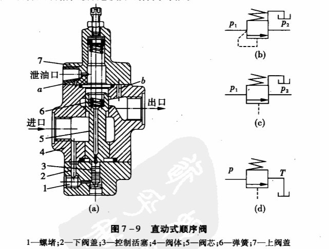 若將下閥蓋2相對于閥體轉過90°或180°,將螺堵1拆下,在該處接控制油管并通入控制油,則閥的啟閉便由外供控制油控制。這時即成為液控順序闊,其圖形符號如圖7 -9(c)所示。若再將上閥蓋7轉過1800,使泄油口處的小孔α與閥體上的小孔b連通,將泄油口用螺堵封住,并使順序闊的出油口與油箱連通,則順序間就成為卸荷閥己其泄漏油可由闊的出油口流回油箱,這種連接方式稱為內泄。卸荷闊的圖形符號如圖7 - 9 (d)所示。
