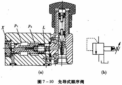 先導式順序閥與直動式順序閥一樣也有內控外泄、外控外泄和外控內泄的控制方式,圖7-lO(a)所示為先導式順序闊的結構原理圖,圖7 -10Cb)為內控外泄式先導順序閥的圖形 符號。