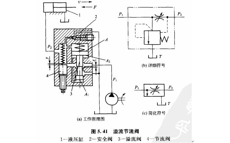 圖5.41為溢流節流閥的工作原理圖。圖中1是液壓缸.2是安全閥.3是定差溢流閥.4是節流閥。從液壓泵輸出的壓力油隊,一部分通過節流閥4的閻口y.由州汕口處流出,壓力降為ρz.進入液壓缸1.使活塞克服負載F以速度U運動;另一部分則通過溢流閥3的閥口Z溢回油箱。溢流閥閥芯上端的彈簧腔與節流閥4的出口(pz)相通,其肩部的油腔和下端的油腔與入口壓力油如相通。在穩定工況下,當負載力F增加,即出口壓力pz增大時,溢流閥閥芯上端的壓力增加,閥芯下移,溢流口Z減小,液阻加大,使液壓泵供油壓力P1增加,因而使節流閥前后的壓差可基本保持不變。當pz減少時,溢流閥溢流口x加大,液阻減少,使液壓泵出口隊相應減小,同樣使基本保持不變。另外,當負載扣超過安全閥的調定壓力時,安全閥2將開啟。溢流閥閥芯的受力平衡方程為