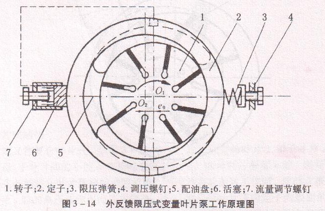 單作用式葉片泵的變量方法是改變其偏心距e的大小,偏心距可通過手動調(diào)節(jié),也可自動調(diào)節(jié)。自動調(diào)節(jié)的變量泵可根據(jù)其工作特性的不同分為限壓式、恒壓式和恒流量式三類,其中以限壓式應(yīng)用較多。