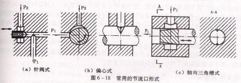 圖6 -18是常用的三種節流口形式。圖6 -18(a)為針閥式節流口,針閥做軸向移動,政主通流面積,以調節流量,其結構簡單,但流量穩定性差,一般用于要求不高的場合。圖6-8(b)為偏心式節流口,閥芯上開有截面為三角形或矩形的偏心槽,轉動閥芯就可改變通流亙積以調節流量,其閥芯受徑向不平衡力,適用于壓力較低的場合。圖6-18(c)為軸向三角噎式節流口,閥芯端部開有一個或兩個斜三角槽,在軸向移動時,閥芯就可改變通流面積的小,其結構簡單,可獲得較小的穩定流量,應用較廣泛。