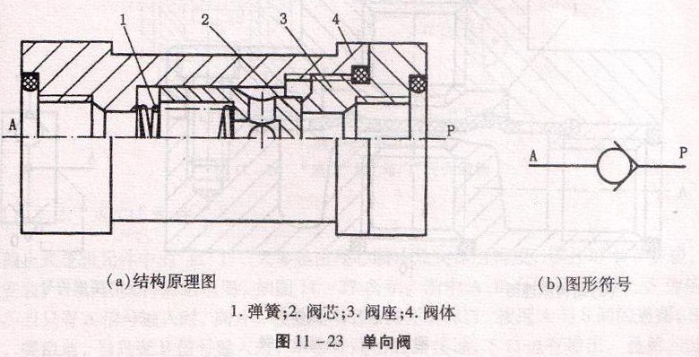 圖11 -23為單向閥的結構圖及其圖形符號。當氣流從P口進人時,氣壓力克服彈簧力和閥芯2與閥體4之間的摩擦力,使閥芯左移,閱口打開,氣流正向通過。為保證氣流穩定流動,P腔與A腔應保持一定壓力差,使閥芯保持開啟狀態。當氣流反向進入A腔時,閥口關閉,氣流反向不通。